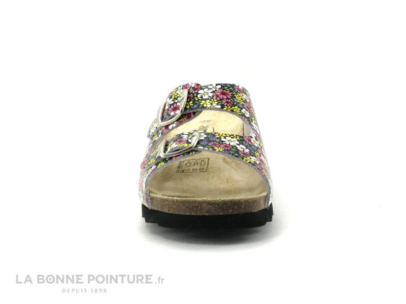 Ces mules réglables Femme Artika Gadin Margy sont en cuir lisse imprimé floral sur fond noir, avec plein de fleurs aux tons de jaune, de rose, de bleu et de blanc.