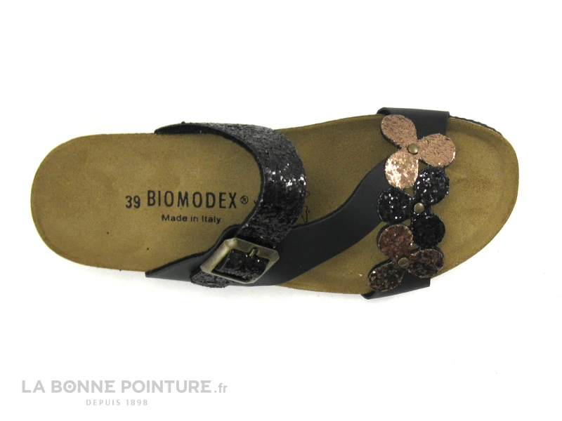 Cette mule anatomique Femme Biomodex combine des lanières noir mat et noir glitter, avec 3 fleurs brillantes bronze et noire sur le dessus de la chaussure.