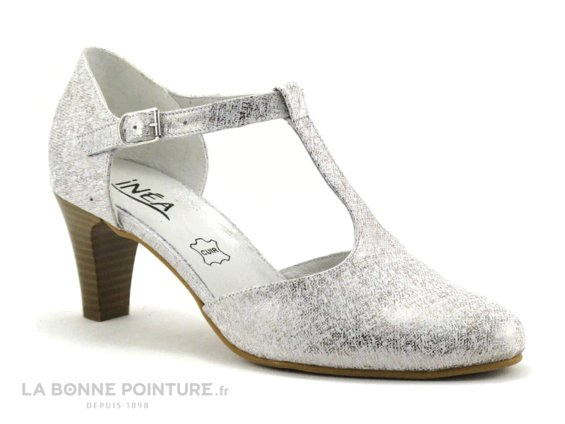 Cette chaussure à talon Inéa est en cuir de chèvre blanc et gris métal, avec la bride salomé qui habille le dessus du pied.