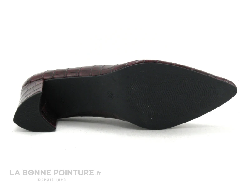 Cet escarpin pointu est bordeaux foncé aspect croco, pour suivre de près la tendance reptile du moment…