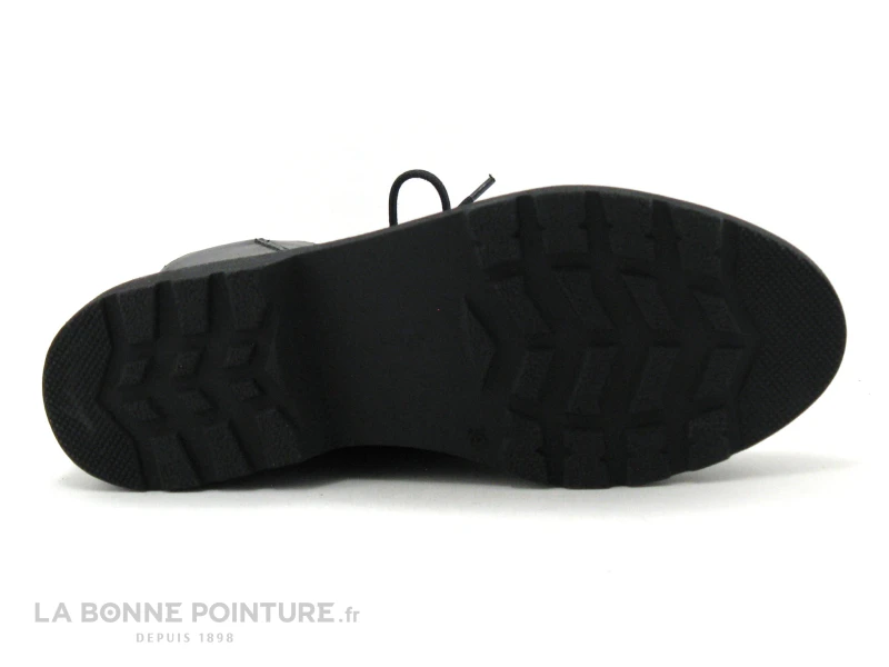 Cette bottine Femme Ă lacet est en cuir lisse noir, avec 5 oeillets de forme trapèze mĂ©tallisĂ©s qui donnent de l’allure au modèle, traversĂ©s par un lacet rond noir.