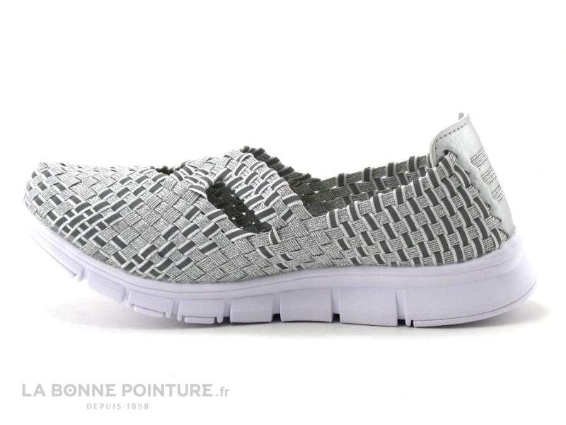 Cette basket slip-on Femme est en élastique gris argent avec des bandes réfléchissantes qui donnent de la brillance selon la luminosité. 2 brides se croisent sur le coup de pied pour un meilleur maintien.