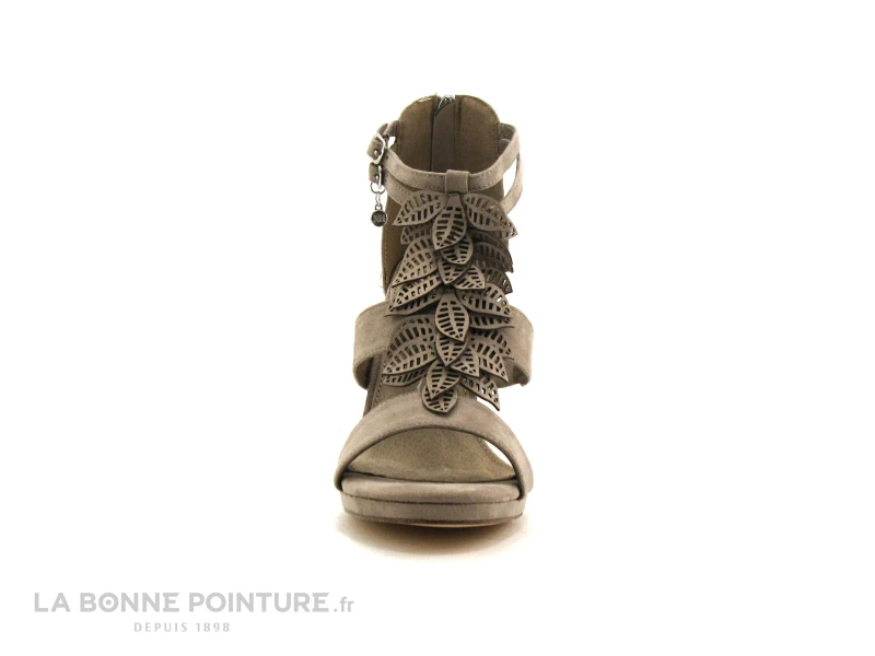Ce nu-pieds Femme est en textile velouté beige taupe, avec une multitude de petites feuilles ajourées qui ornent la bride salomé.